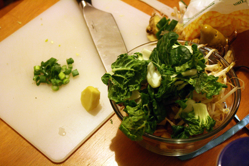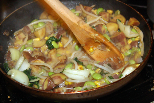 • After a couple minutes, add corn, edamame, red onion, bean sprouts, bok choy, scallions, sesame oil and soy sauce.