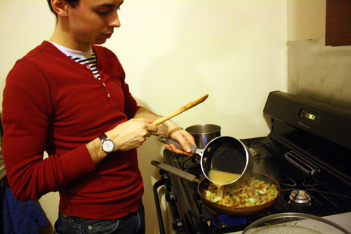 • Add miso broth to veggies; add flour about a half-tablespoon at a time and mix until you get your desired consistency. It should be sort of like a stew/gravy (this is where we messed up a bit; I think we added too much flour).