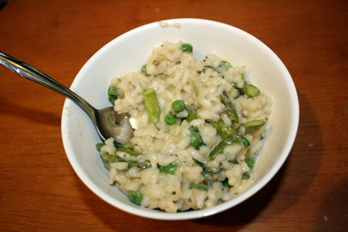 Asparagus risotto. Petra’s and my first attempt at risotto; we didn’t get the texture quite right, but it tasted fine. We added peas, used scallions instead of spring onions, and used parm + shredded white cheddar.