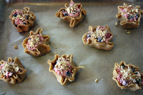 • Based on how these turned out, I highly recommend baking these in lightly-greased muffin tins instead of on parchment paper like we did. Shape them into the cups, scoop in the filling (about 1/4 c), and fold any remaining dough over the top.