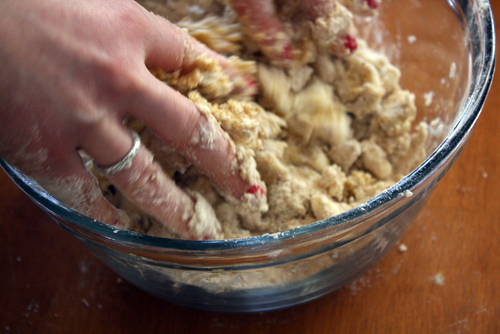 • In a large bowl, mix boths flour, sugar and salt. Add the butter (already cut into pieces) and use two knives or your hands to mix in the butter until it resembles coarse meal.
