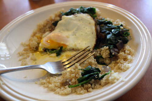 Spinach, onions and quinoa topped with a sunny-side-up egg (recipe here)