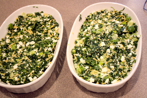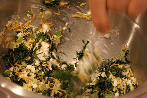 • Mix the cottage cheese, cheddar cheese and scallions in with the spinach.