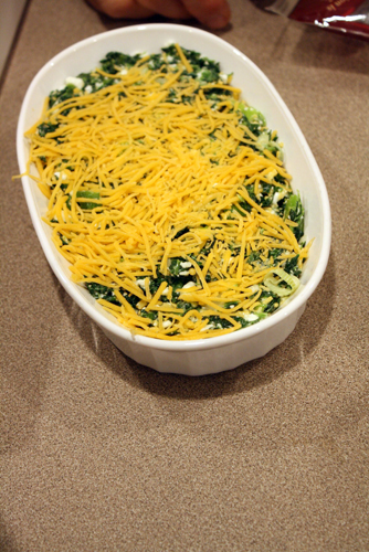 • Spread into an 8-inch baking dish (or two smaller dishes) and sprinkle shredded cheese on top.