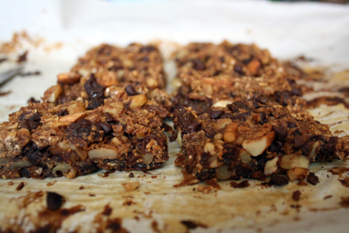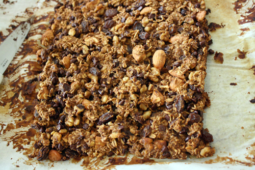 Orange oatmeal bars with nuts, chocolate chips and vodka-soaked raisins (recipe here)