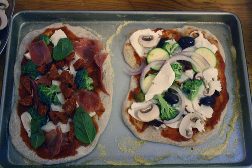 Eugenia: Half 1 — pesto, basil, mushrooms, mozz, zucchini, onions, sundried tomatoes; Half 2 — red sauce, broccoli, prosciutto, chorizo, basil, tomatoes