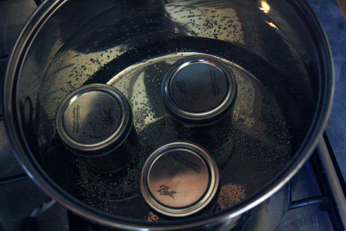 • Start boiling water in a large, tall pot (I used a stockpot); enough so that when you put the jars in, there will be at least an inch of water above them. In a small pot, start boiling the jar lids in water.