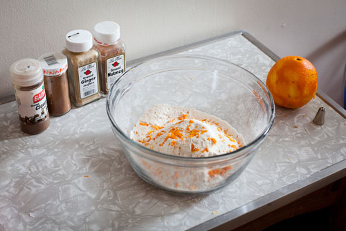 • Sift together flour, salt, baking powder and spices in a medium bowl; add the orange zest and set aside.
