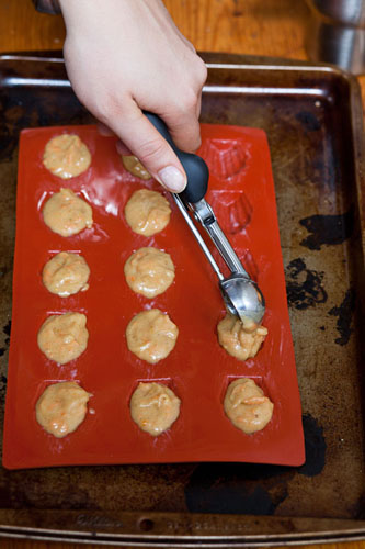 • Fill the Madeleine pan(s), right to the top of each shell. As always, I used a small batter scoop and it helped keep the mess to a minimum… Bake for about 8 minutes, until the edges are just brown and the Madeleines pop right out. If you’re using the standard-size pans, you’ll have to bake for longer — maybe 12 minutes (also until the edges are brown)? Serve with the cinnamon/powdered sugar mixture (optional).