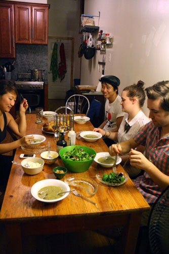 So, the food: My best friend Jenni came to visit a couple weeks ago, and even though our plans to actually go apple-picking fell through, we decided to go forward with the apple-themed dinner we’d planned. I wouldn’t say we worked till we were sore, like in the song, but we certainly worked hard: apple-honey challah, salad, apple-pear crisp, and this soup as the main dish. Fleet Foxes are the ultimate fall band, and my falls are typically all soup all the time, so that part was easy. You’re probably thinking broccoli and apple sounds like a strange combination, or assuming that this is a sweet dish — but it’s actually mostly savory and the apples add just a touch of sweetness (and I’d consider most of Fleet Foxes’ music savory, but with sweetness in the harmonies). The apples are roasted in olive oil, thyme, sage, salt and pepper — definitely not your typical cinnamon and nutmeg. And, the soup is vegan since Pecknold is, too.