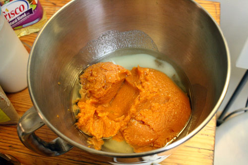 • In a large bowl (or the bowl of an electric mixer), beat together the pumpkin, both sugars, oil and instant coffee. Add the eggs one at a time, making sure each is well incorporated before adding the next.