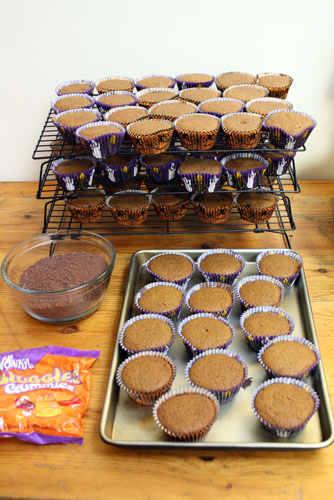 Pumpkin-coffee cupcakes with mocha frosting, “dirt” and bugs (recipe here)