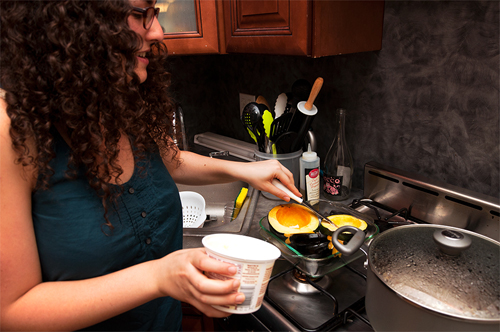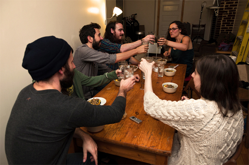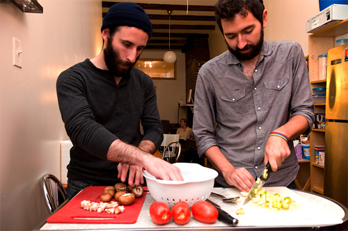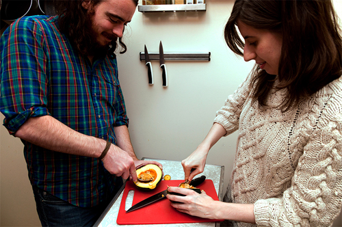 I’m excited that we were able to time this post with Thanksgiving, because the Loom’s music is perfect for sitting around a big table with friends, and so is this dish. I first heard the Brooklyn-based folk-rock band last year, and it was their communal energy — shared vocals, two bandmembers playing percussion, and a song about having all your friends over to watch fireworks — that drew me to their music. Their songs are also very autumnal, with plenty lines that mention the changing of the seasons (there’s a gorgeous song on the band’s debut LP, Teeth, called “The First Freeze”). So when the band — John Fanning (guitar, vocals), Sarah Renfro (keyboard, vocals, percussion), Lis Rubard (trumpet, French horn), Dan DeSloover (bass, vocals) and Jon Alvarez (drums, vocals) — took over my kitchen last month, I wanted our meal to reflected that. We roasted acorn squash halves and used them as a bowl for a mix of veggies and wild rice (OK, technically it wasn’t “wild rice,” but the closest I could find at Trader Joe’s), and chowed down.