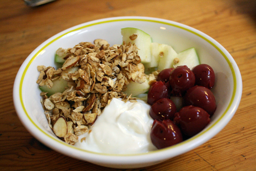 Sesame granola with Greek yogurt, apples and Morello cherries (recipe here)