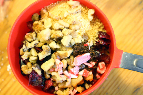About 1 cup of mixins; whatever you can find (nuts, dried fruit, candy, etc.)