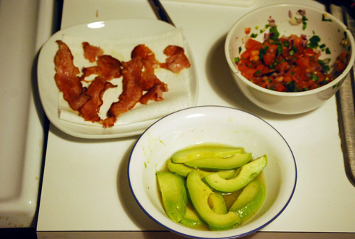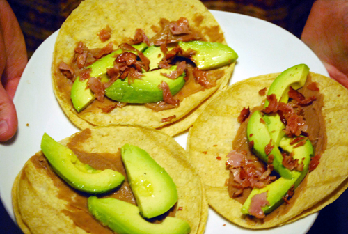 • For each taco, stack two tortillas, smear with refried beans, add avocado, bacon, pico de gallo and queso fresco.