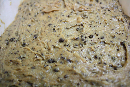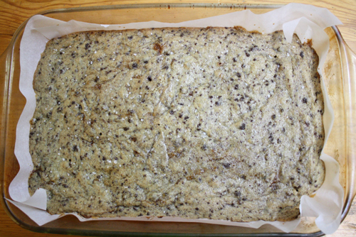 • Carefully cover with the rest of the batter, sprinkle a little bit of sea salt on top, and bake for 40-45 minutes, or until a toothpick inserted in the middle comes out clean.