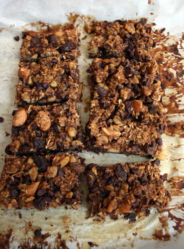 Orange oatmeal bars with nuts, chocolate chips and vodka-soaked raisins (recipe here)